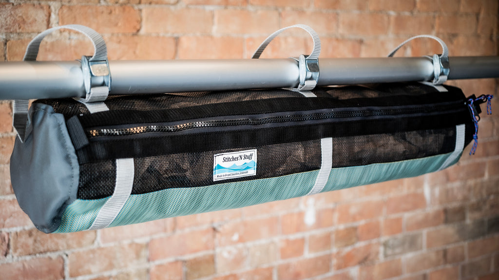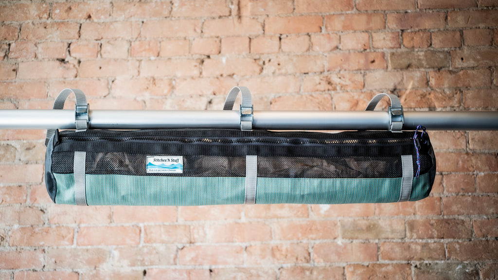 Some like frame pockets, some like frame duffles. We don't judge here. Made out of our stylish multimesh with a second layer of phifertex plus across the bottom and balistic nylon endsto give it enough burliness to handle sand stakes, mallets, or whatever else you need to throw in it. Comes with a full length zipper and three cam buckles for secure attachment.