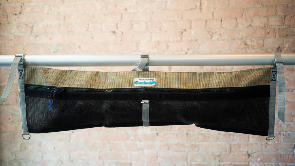 We certainly don't recommend putting a Wocket in here, but you are good to go with pretty much anything else. Easily hangs from any frame member to keep your chapstick, sunscreen, Pelican case, or other bric-a-brac that you need to have regular access to. Phifertex Plus fabric paired with our classic multimesh. The medium and large both feature middle d-rings, as well as d-rings on the bottom outside edges.